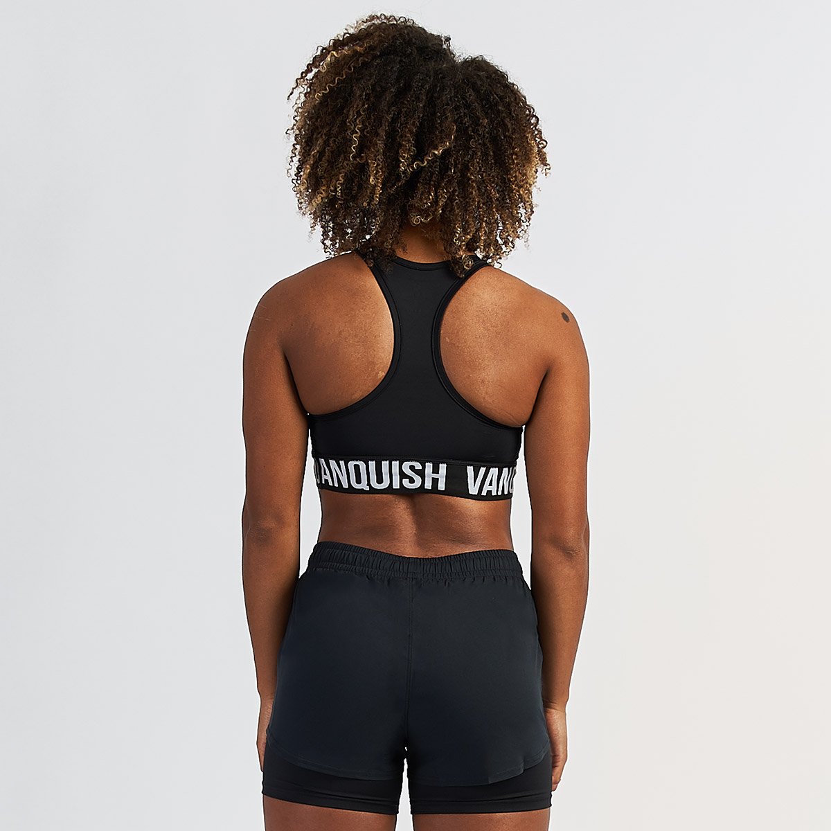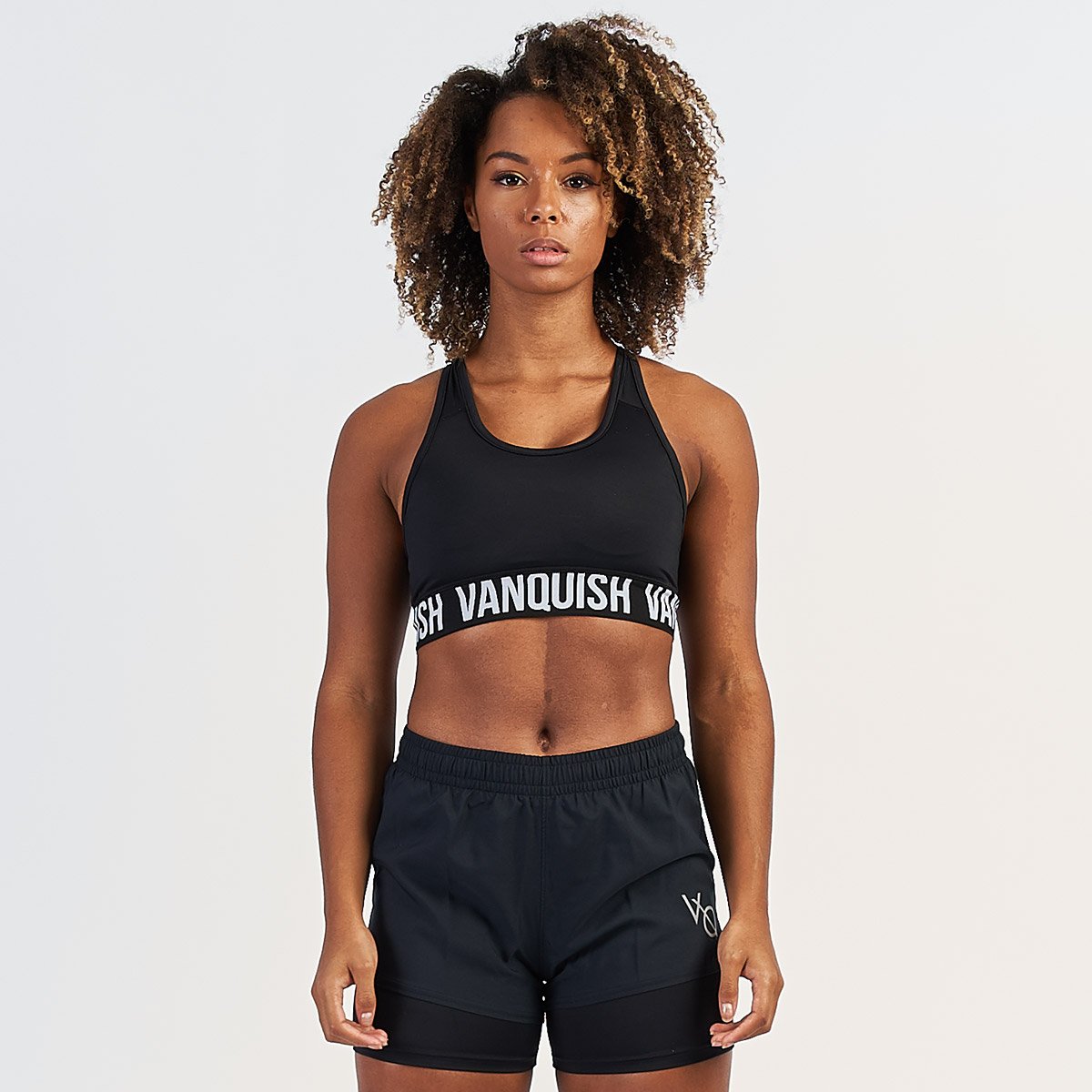 Design: Body-hugging fit with medium support suitable for yoga, exercising or cycling. Featuring a bold Vanquish-branded band for increased comfort and support. Racerback straps to allow your arms to move freely. This sports bra has a hidden mini pocket suitable for small items like keys.