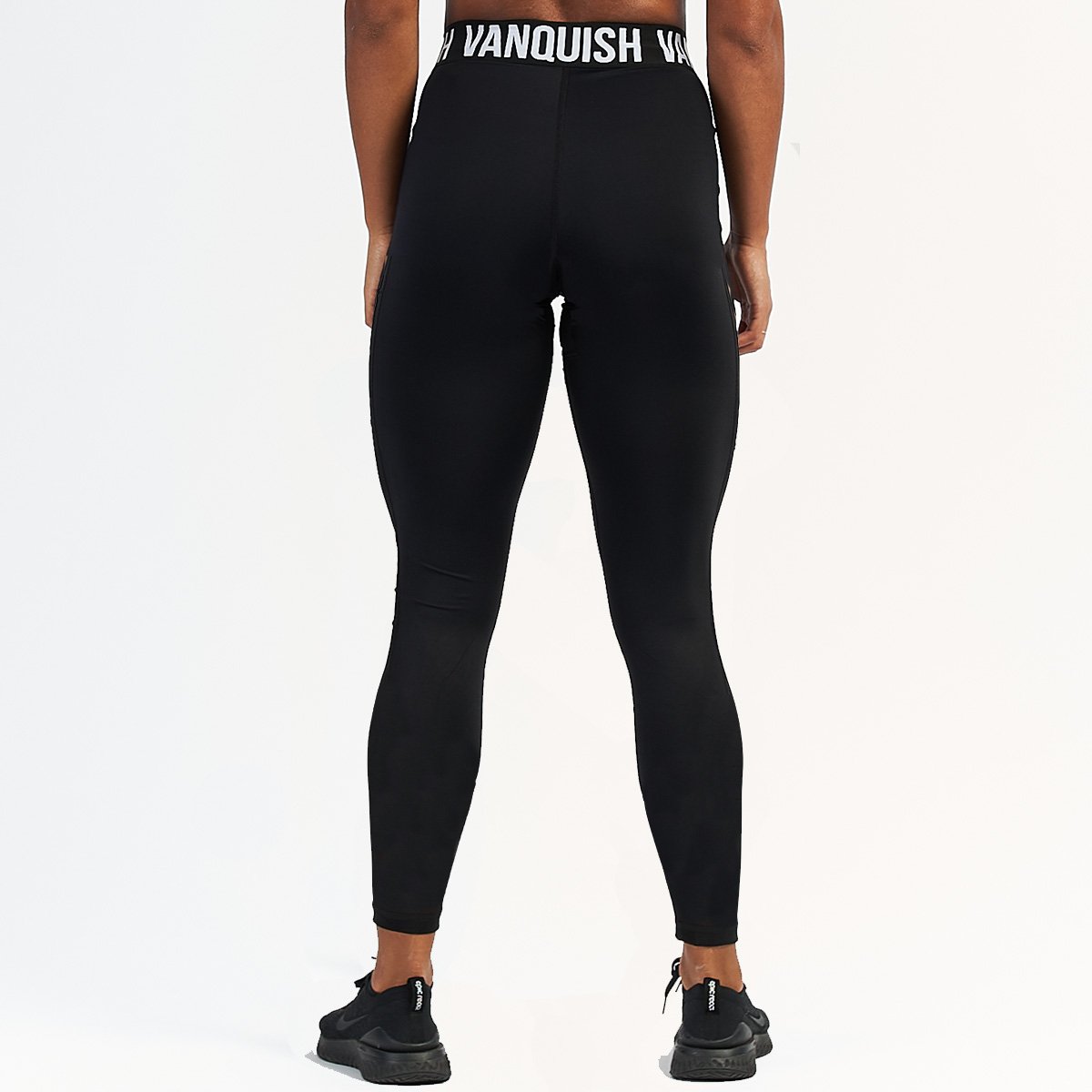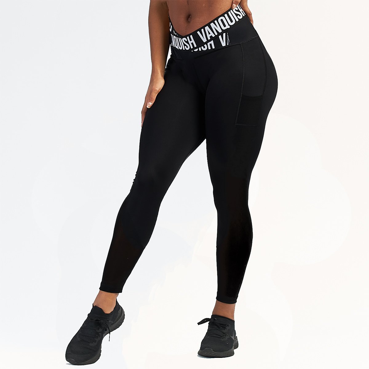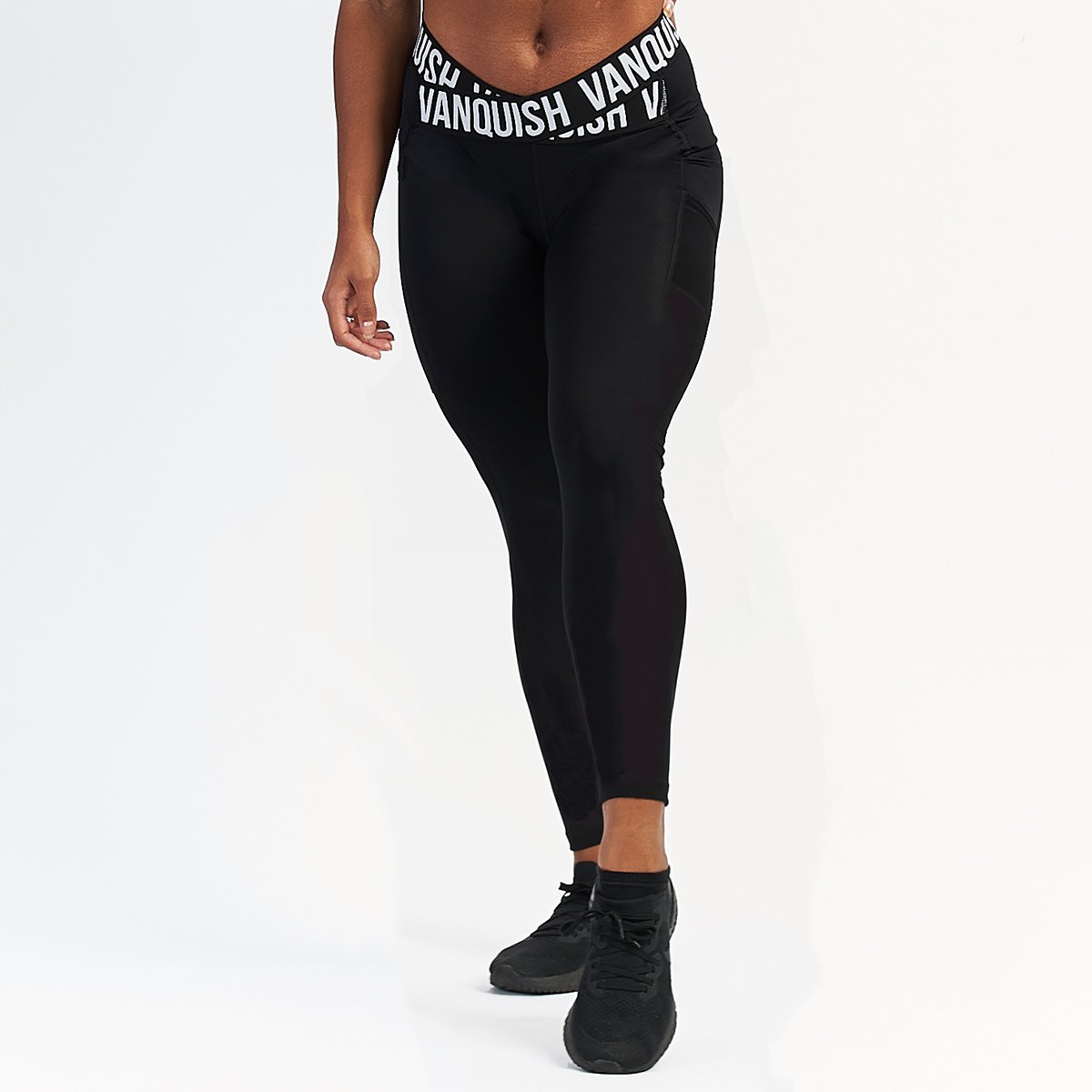 Design: Squat-proof leggings with Vanquish branded crossover bands around the waist to flatter the wearer. Side pockets on both legs suitable for small items such as a phone. Perfect as a standalone piece for the gym.