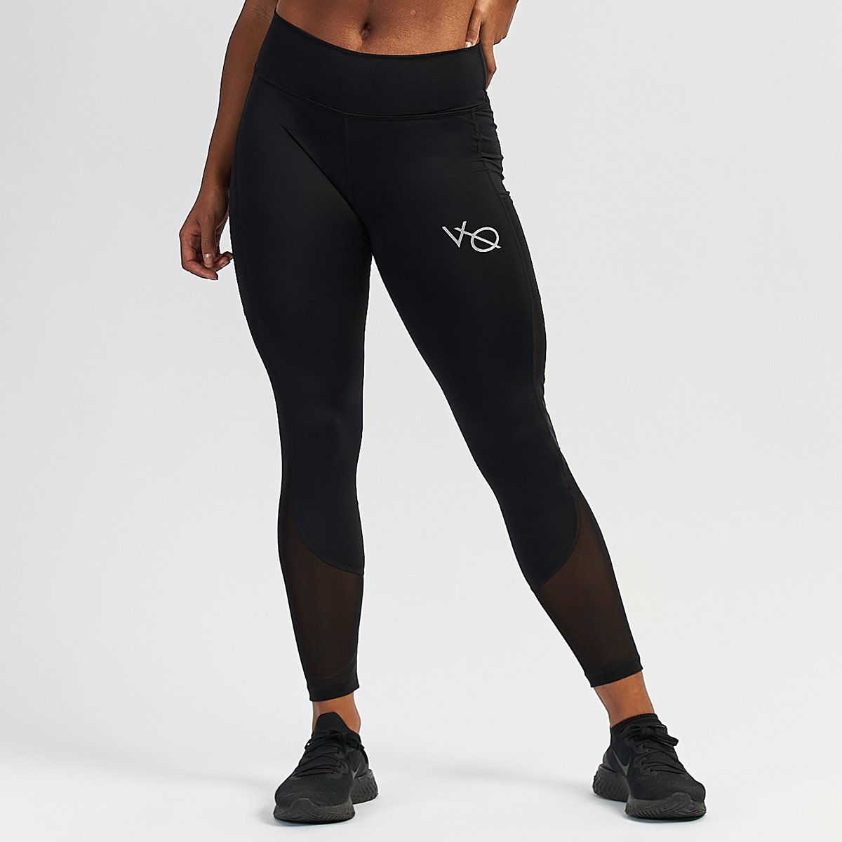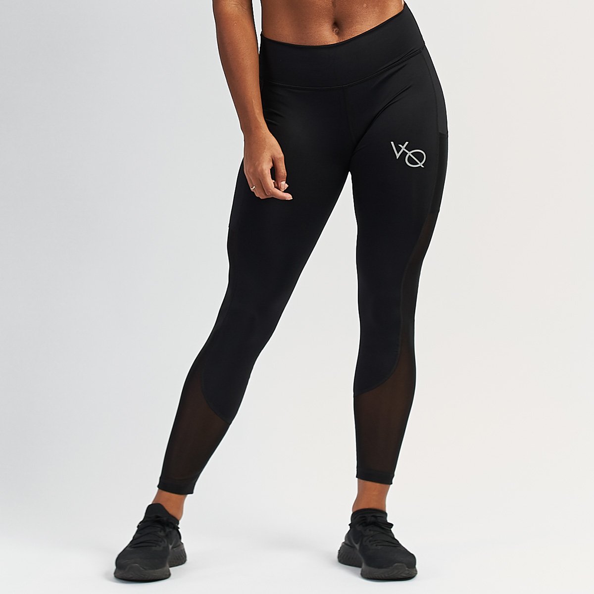 Design: Squat-proof leggings with a high-waisted fit. Reflective VQ logo on the left thigh. Mesh paneling on the outside leg to improve breathability. Mesh pockets on either side suitable for small items such as a phone. Perfect as a standalone or with shorts over them.