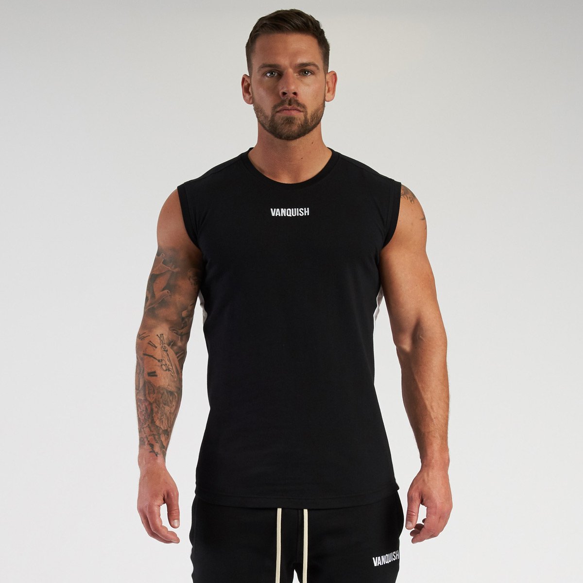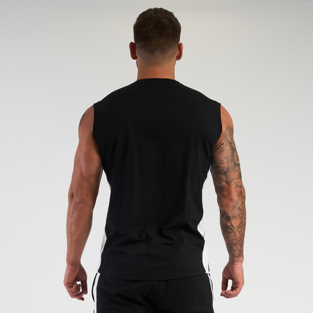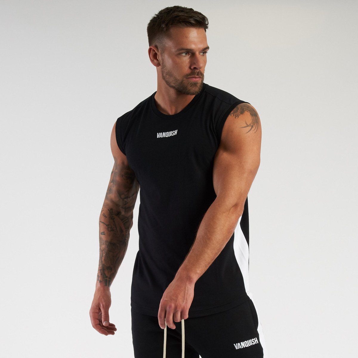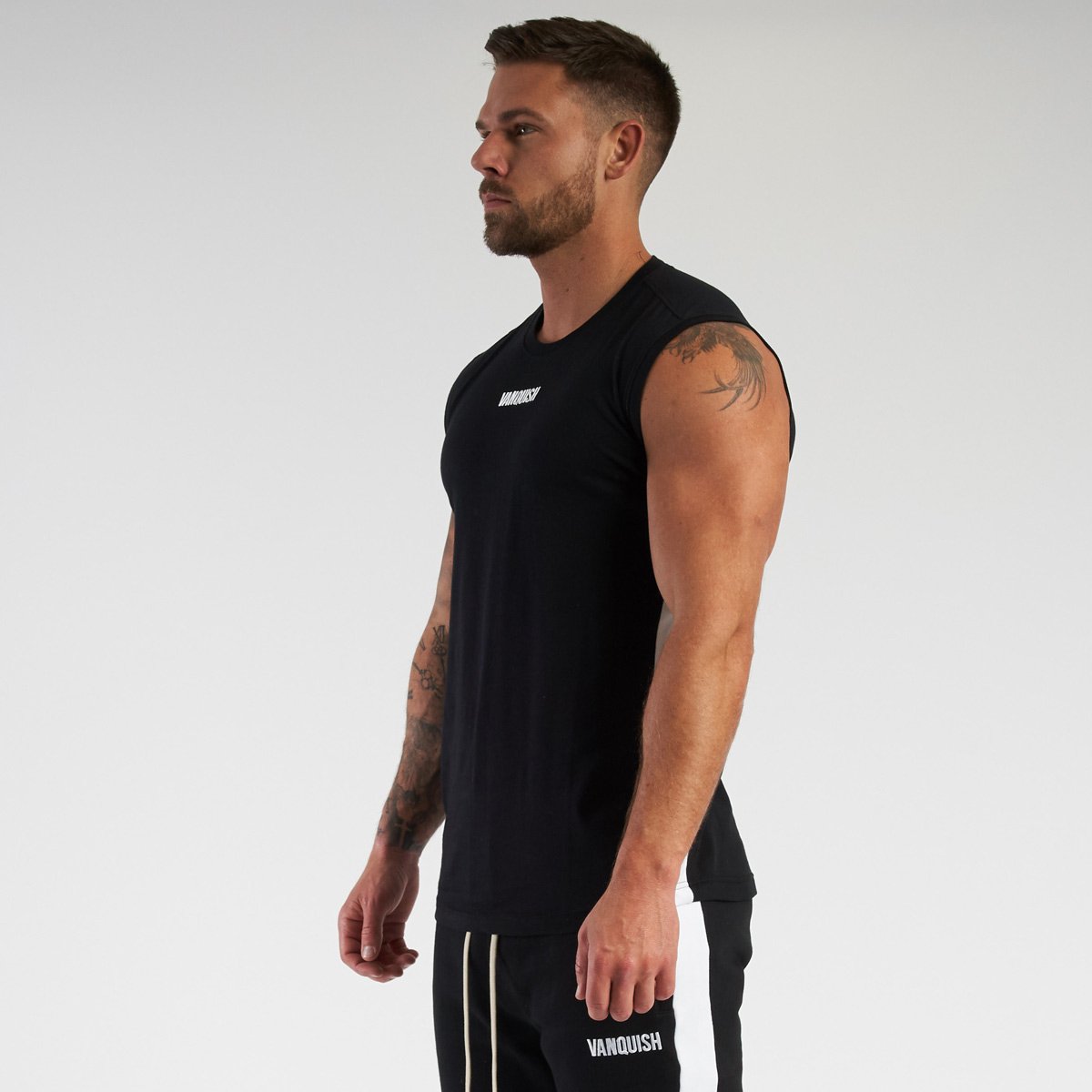 This sleeveless tee has our own custom slim fit. This is made to accentuate the chest whilst slimming the waist.