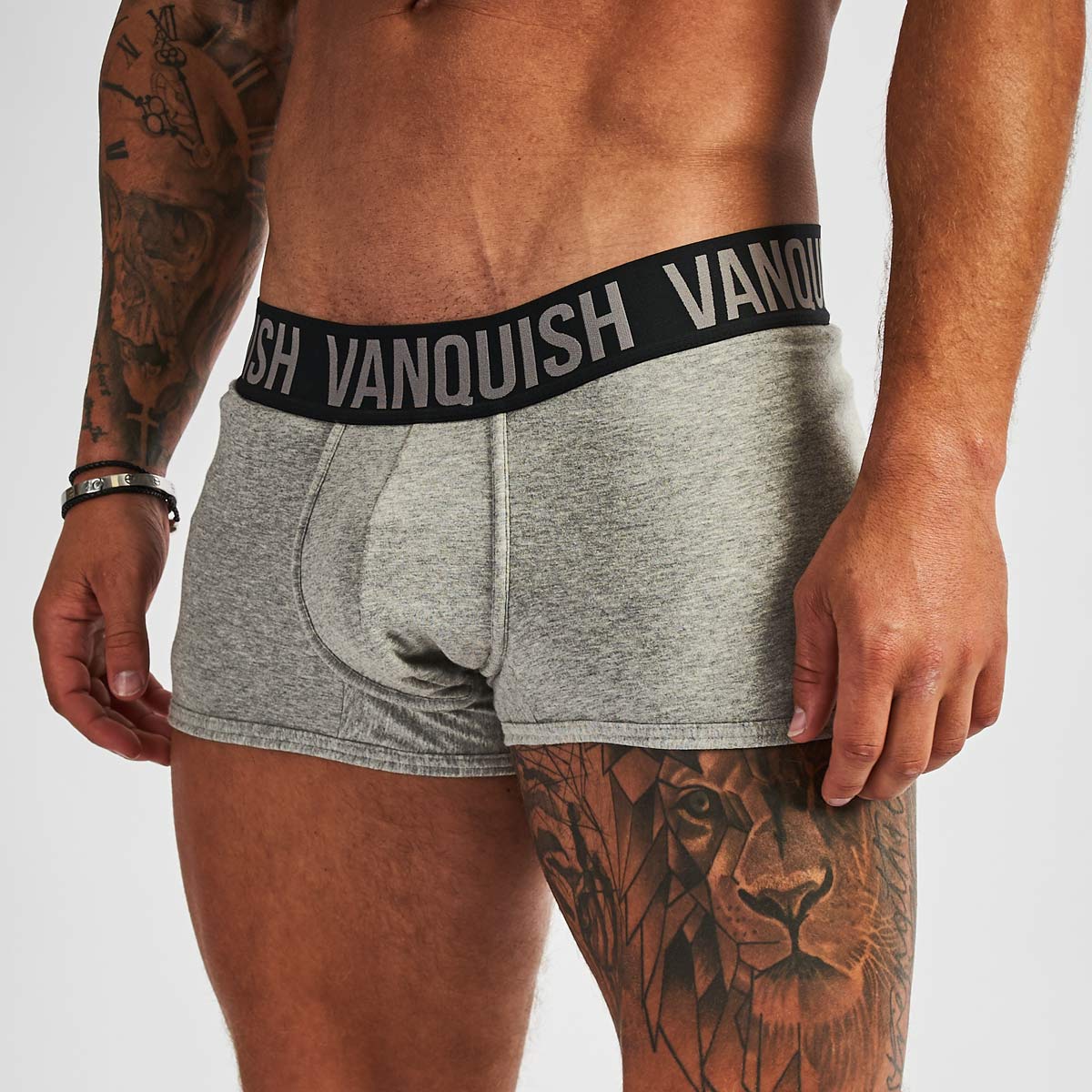 Design: A bold Vanquish branded custom woven super soft waistband sits atop a staple boxer brief silhouette. Featuring two essential colours: Black and Grey.